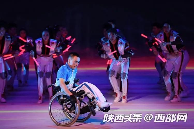 场景再一次切换,舞台上冲出一群手握荧光棒的青年男女,荧光棒在快速变换的阵型里闪烁着,勾勒出科技感十足的炫酷画面。阵型再次变换,一名轮椅舞者自信地站在最前列,熟练操控轮椅跳起街舞,那股冲破一切的热情点燃全场,散发出无限光芒。