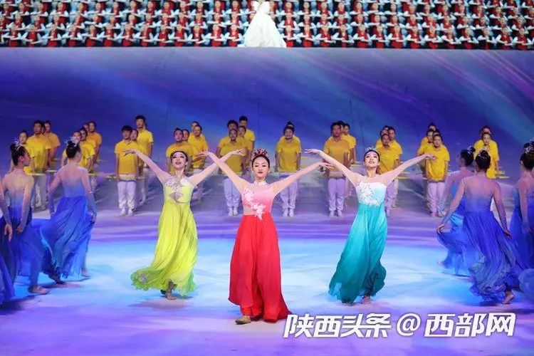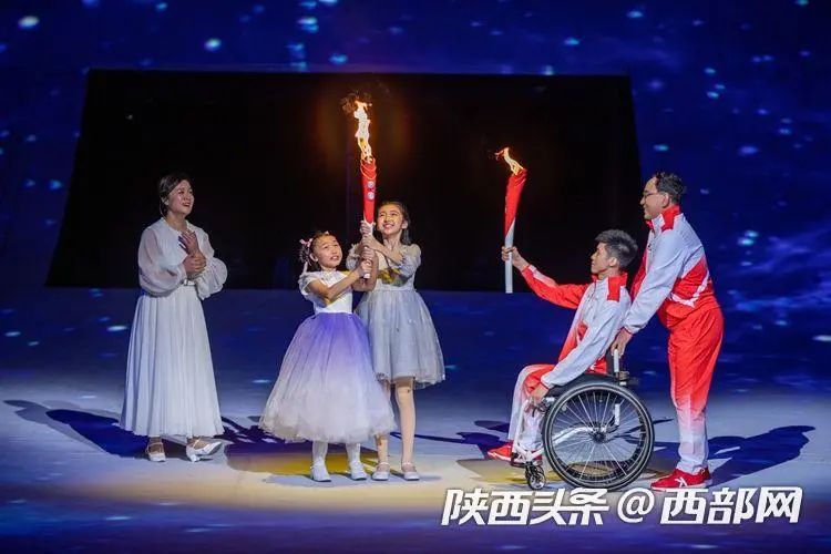 文体展演最后,歌唱家雷佳和所有演员汇聚在舞台中央,唱响主题歌《心中有光》。心中有光,世界就亮,在经久不息的合唱声中,本届残特奥会开幕式迎来了重要时刻——点火仪式。北京冬残奥会运动员刘正慧、陕西籍特奥运动员杨乐、东京残奥会广东籍冠军运动员周国华、陕西籍残疾人乒乓球运动员翟翔依次进行场内火炬传递。