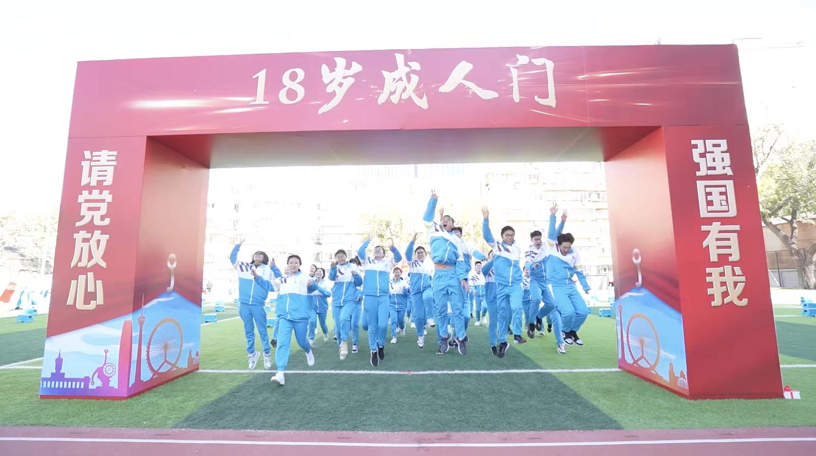 同学们在领誓人的带领下面向国旗,庄严宣誓,随后从领导手中接过《中华人民共和国宪法》,戴上成人纪念章,向师长鞠躬行感恩礼。伴随着《歌唱祖国》的乐声响起,一幅巨幅国旗在同学们手中缓缓托举传递,所到之处尽是同学们坚毅的眼神和高举的双臂。最后,同学们列队走过成人门,正式宣告自己迈入成人行列。