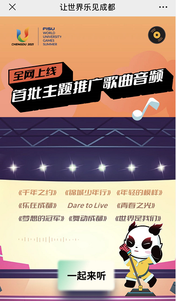 2020年11月,成都正式向全球发出邀请,启动成都第31届世界大学生夏季运动会歌曲大众征集活动,活动得到了全球音乐人及各行业音乐爱好者的广泛支持和积极参与,共征集到来自数十个国家和地区的2700余件音乐作品。经过大众投票和专家委员会多轮评审,最终20首成都大运会主题推广歌曲脱颖而出。