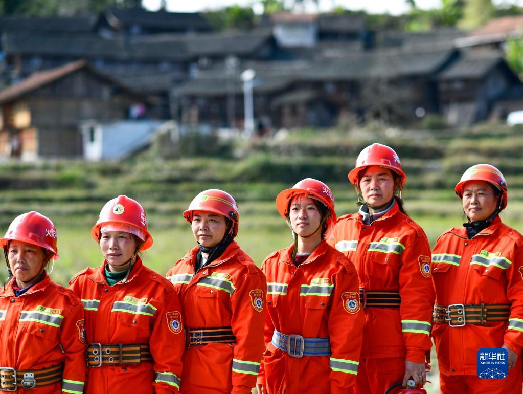 贵州省天柱县高酿镇木杉村女子义务消防队部分队员合影(11月9日摄)。
