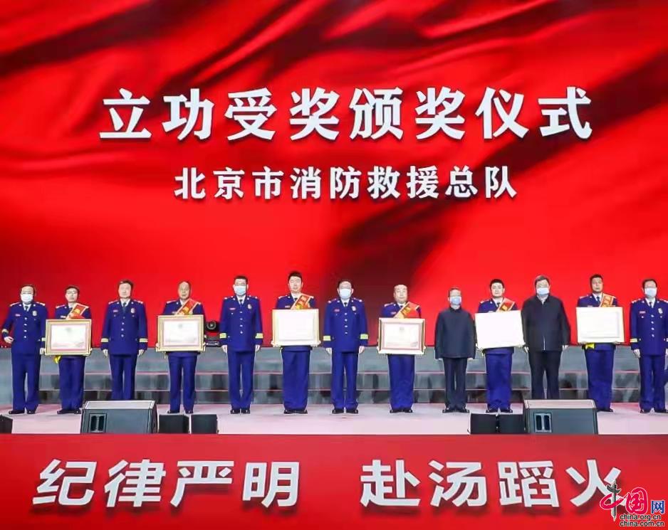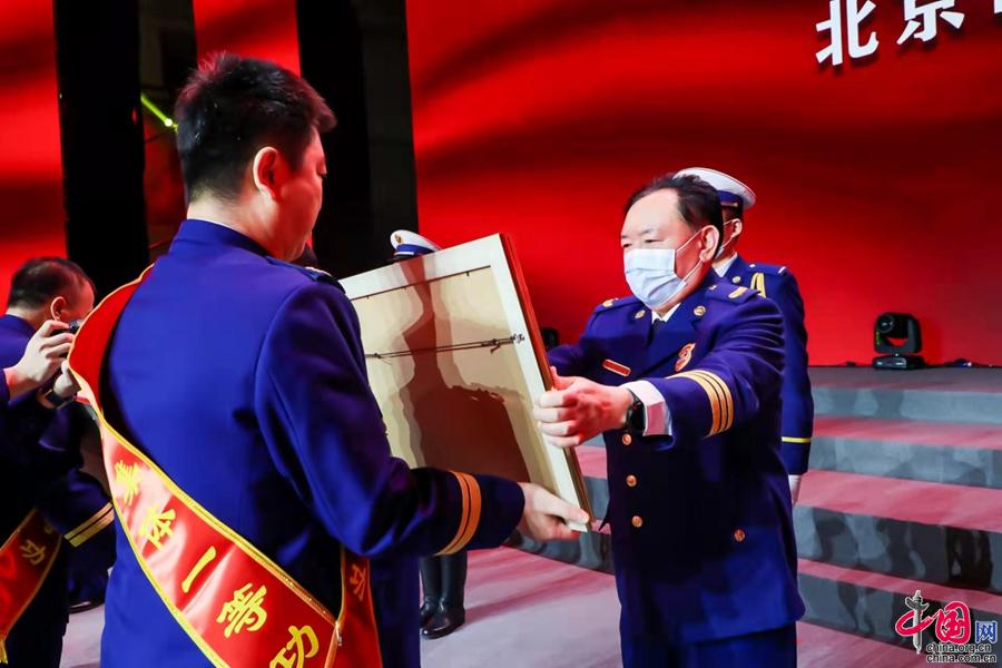 应急管理部党委委员、消防救援局局长琼色为北京市朝阳区消防救援支队颁发集体一等功奖状,李兴华支队长代表支队全体指战员接受表彰。
