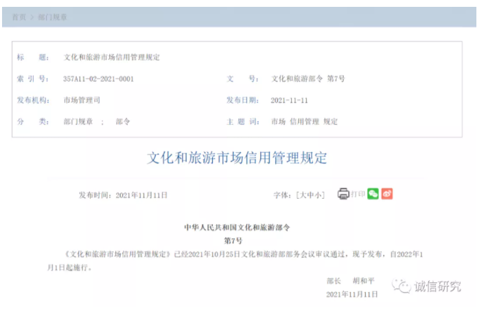 《文化和旅游市场信用管理规定》已经2021年10月25日文化和旅游部部务会议审议通过,现予发布,自2022年1月1日起施行。