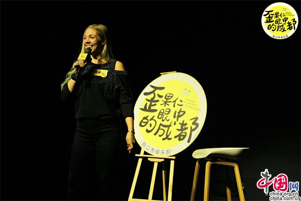 在凤求凰剧场,美国友人Mary用一口流利的普通话,向观众讲述了这些年来她在成都生活的经历,并表示热爱成都的美食、悠闲。她调侃成都发展迅速,拥有一环路、二环路、三环路……像一盘匍匐在成都平原的蚊香。调侃成都人像大熊猫一样,爱吃、爱耍,可爱、风趣。