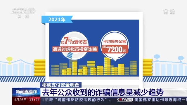 中国银联风险控制部高级总监 王宇:国家监管部门出台了多项的治理措施,公安机关也开展了多次打击行动。所以说在(收到)诈骗信息上、损失上,这两个指标应该说都有明显的改善。同时,2021年的移动支付风险也有一些新的变化,网络直播诈骗、虚拟币投资诈骗,这两类风险应该说占比还是比较高的。