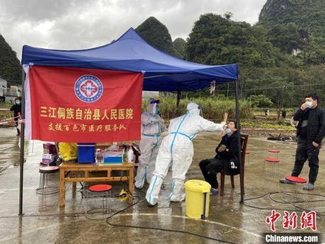 图为三江侗族自治县人民医院支援百色医疗服务队医护人员在开展核酸采样。 单依 摄