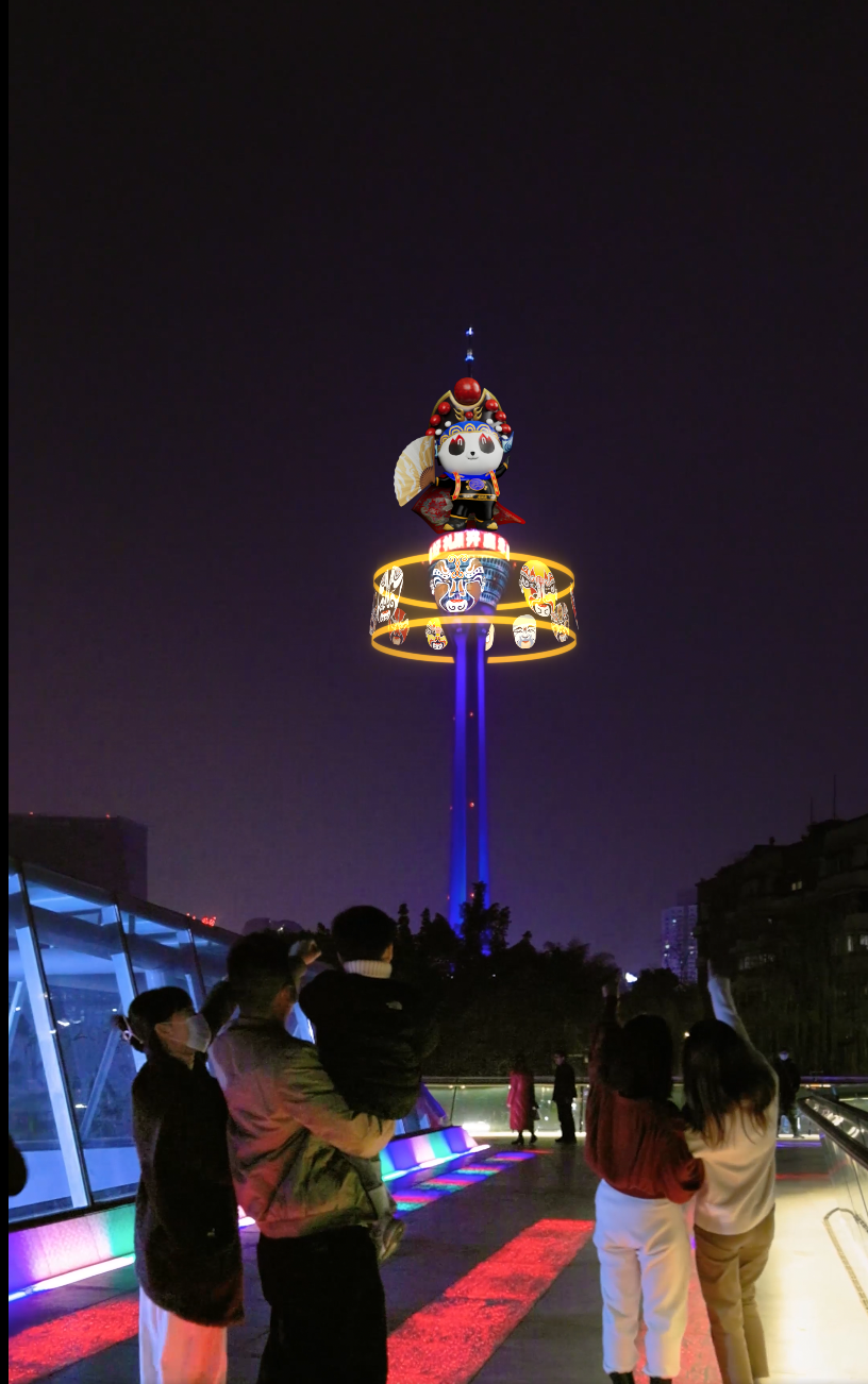 短视频里,成都锦江之畔,天府熊猫塔下,人们正徜徉在浪漫的夜色之中,烟火气十足的幸福生活被一场快闪一般的AR光影秀激起了高潮。