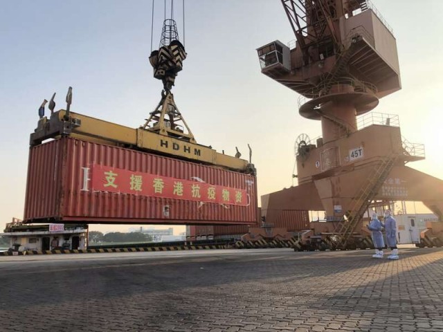 2月24日,在佛山海关驻顺德办事处24小时供港防疫物资专窗,一批出口香港的防疫物资办妥通关手续,100万个医用外科口罩共计4个标准集装箱,从北滘港启运。同日,约25万人份新冠抗原检测试剂盒在顺德容奇港通过供港物资绿色通道快速通关启运。