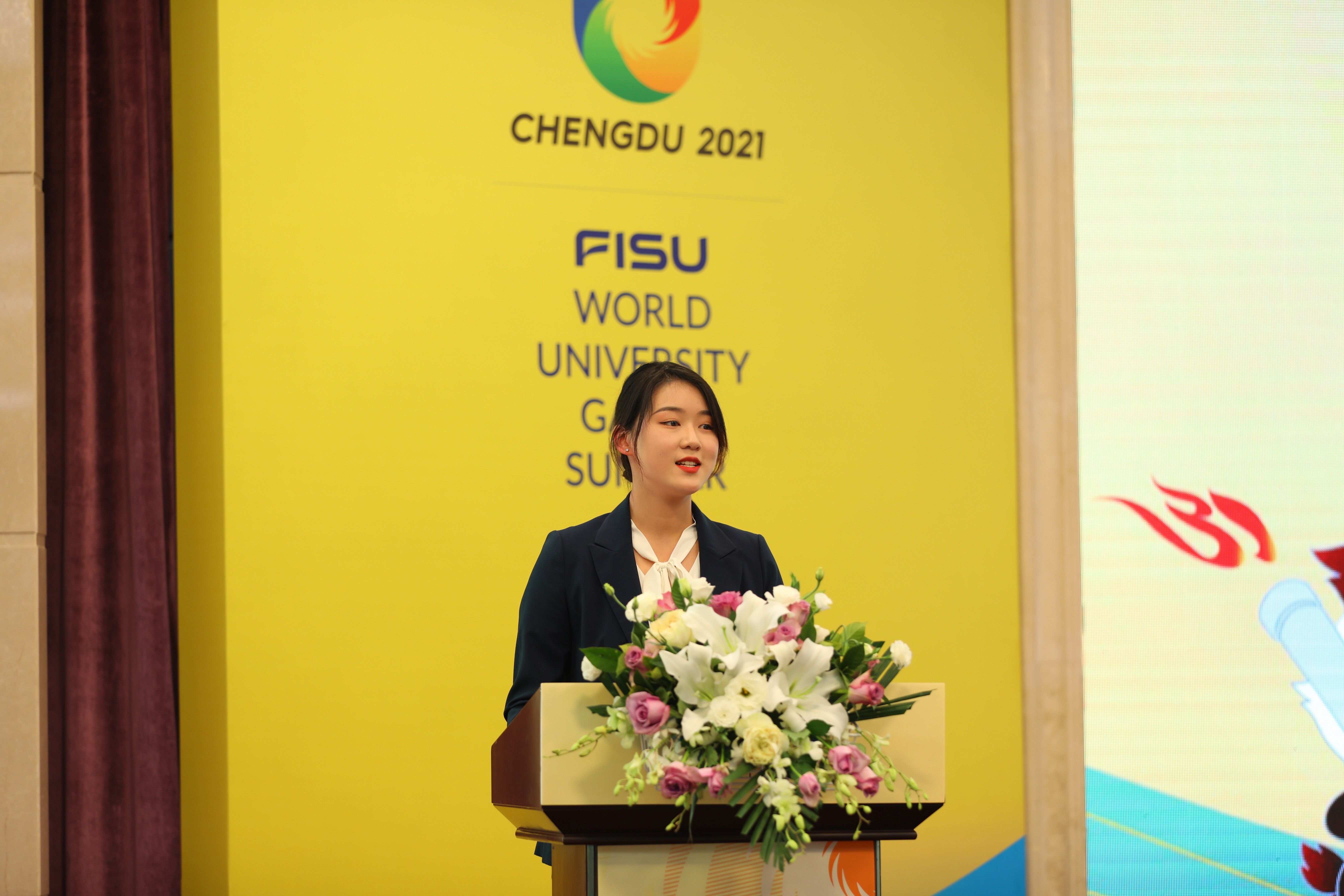 成都大运会不仅是一场全世界青年交流的体育盛会,也 是当代大学生向世界展示青春形象的舞台。本次歌曲推广专家委员会成立仪式上,还特别邀请了在蓉高校大学生和在川留学生代表进行交流发言,分享他们的大运音乐故事。