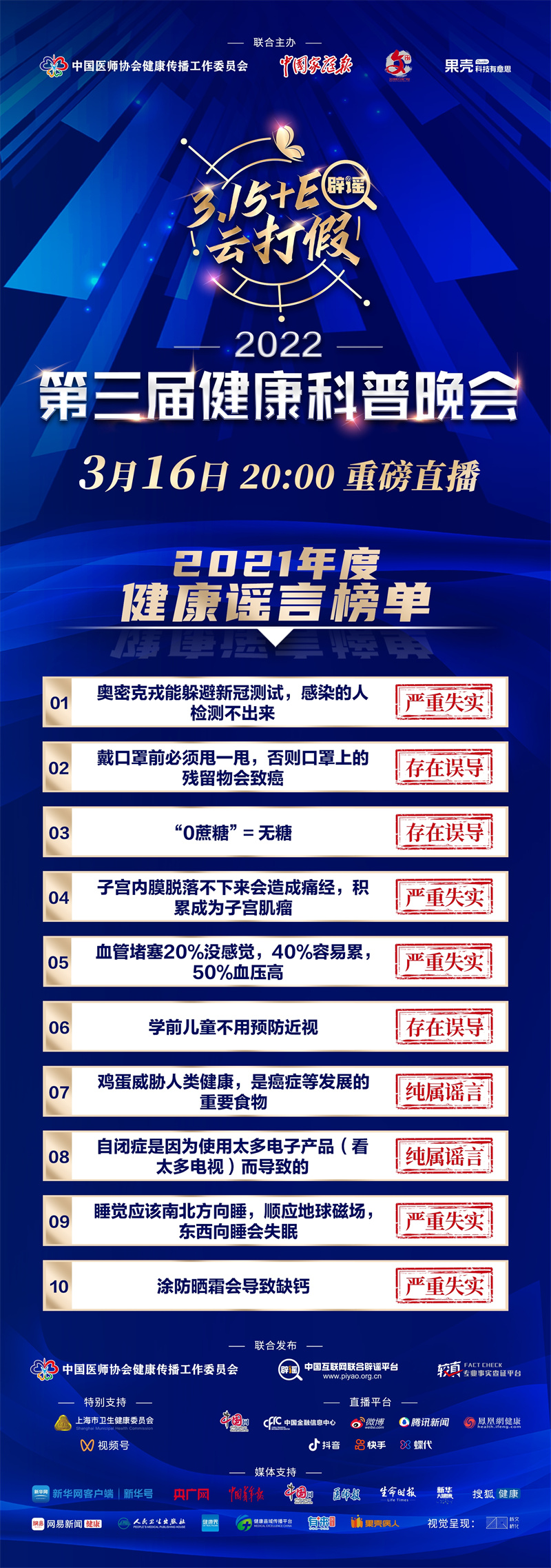 根据热度指数、危害指数、迷惑指数,中国互联网联合辟谣平台、中国医师协会健康传播工作委员会、中国家庭报社、腾讯新闻较真平台在晚会上联合发布了2021年度十大健康谣言榜单。