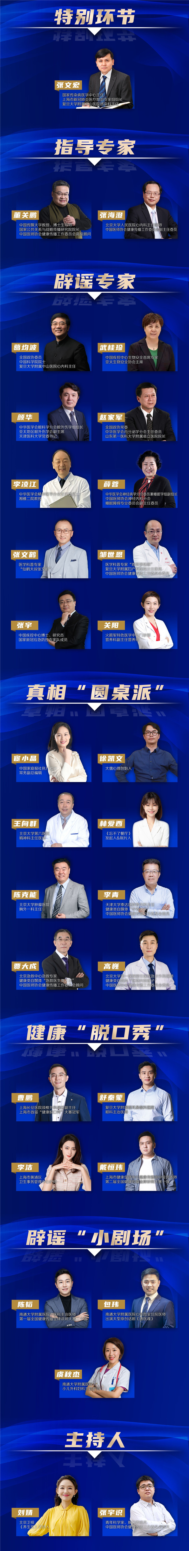 中国疾控中心生物安全首席专家、亚太生物安全协会主席武桂珍,中华医学会眼科学分会眼外伤学组组长、亚太地区眼外伤学会副主席、天津医科大学党委书记颜华,全国政协常委、中华医学会内分泌学分会主任委员、山东第一医科大学附属省立医院院长赵家军,中华医学会精神医学分会主任委员、湘雅二院教授李凌江,中华医学会神经病学分会委员兼睡眠学组副组长、中国医师协会神经内科分会睡眠障碍专业委员会副主任委员薛蓉以及医学科普专家张文鹤、邹世恩、张宇等组成了辟谣专家团,专业视角、精准解读,剥去外衣、亮出真相,他们共同向健康谣言说“不”!