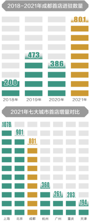 数据显示,2021年,成都首店数量创新高,夯实首店经济第三城地位,继续领跑新一线城市,且增速超过上海北京。2021年共计引入801家各类首店,其中全国首店78家。