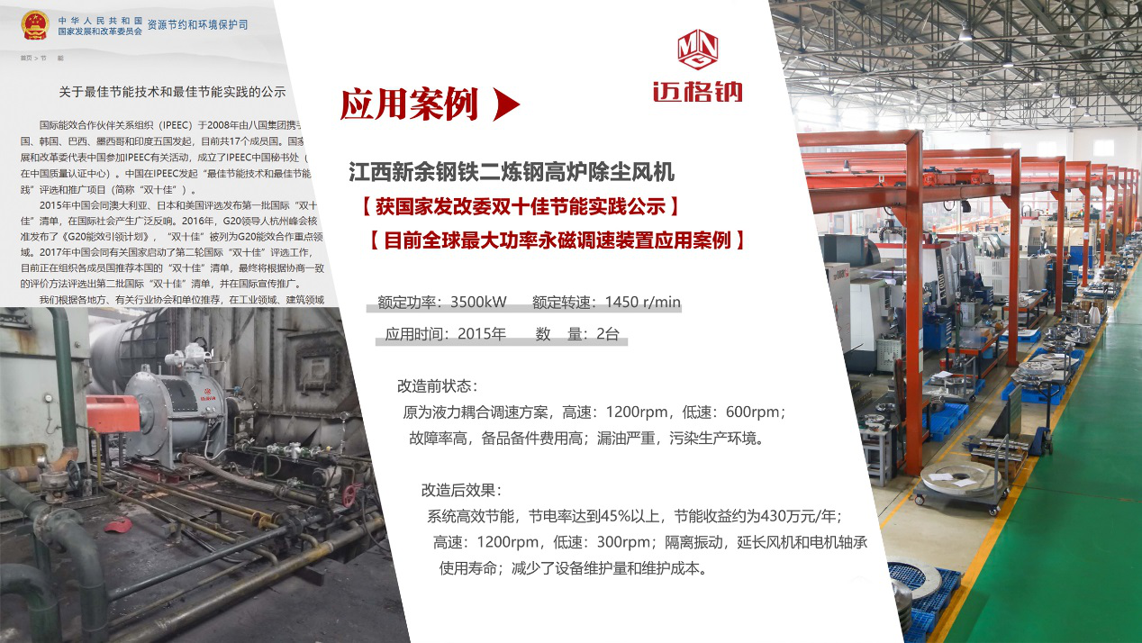 据了解,迈格钠的永磁传动节能技术是依据现代磁学理论,应用永磁材料所产生的磁力作用,完成力或力矩无接触传递,实现能量的空中传递的一项新技术。现已成功应用于全国29个省市,在矿山、冶金、化工、水泥、电力、水处理等行业的泵、风机和皮带机等设备上广泛发挥效用,对工业节能与绿色发展产生了巨大的推动促进作用。