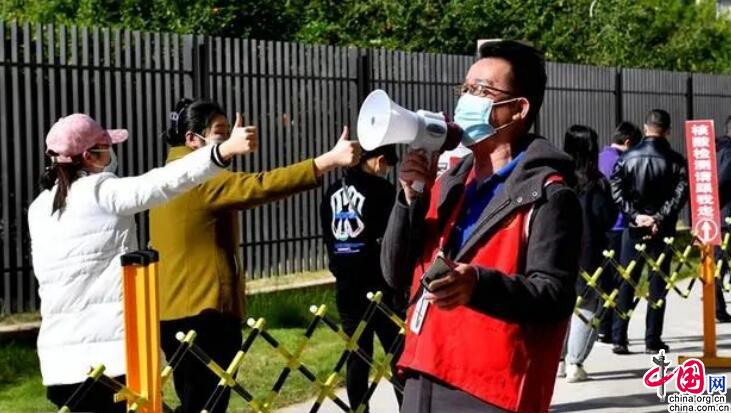 4月5日上午8 时半,在福州市鼓楼区洪山镇大凰山社区乌山府核酸检测点内,社区党员志愿者、退役军人张金生现场即兴演唱《我和我的祖国》,一边鼓励居民,一边维持现场秩序,不少居民竖起大拇指点赞。