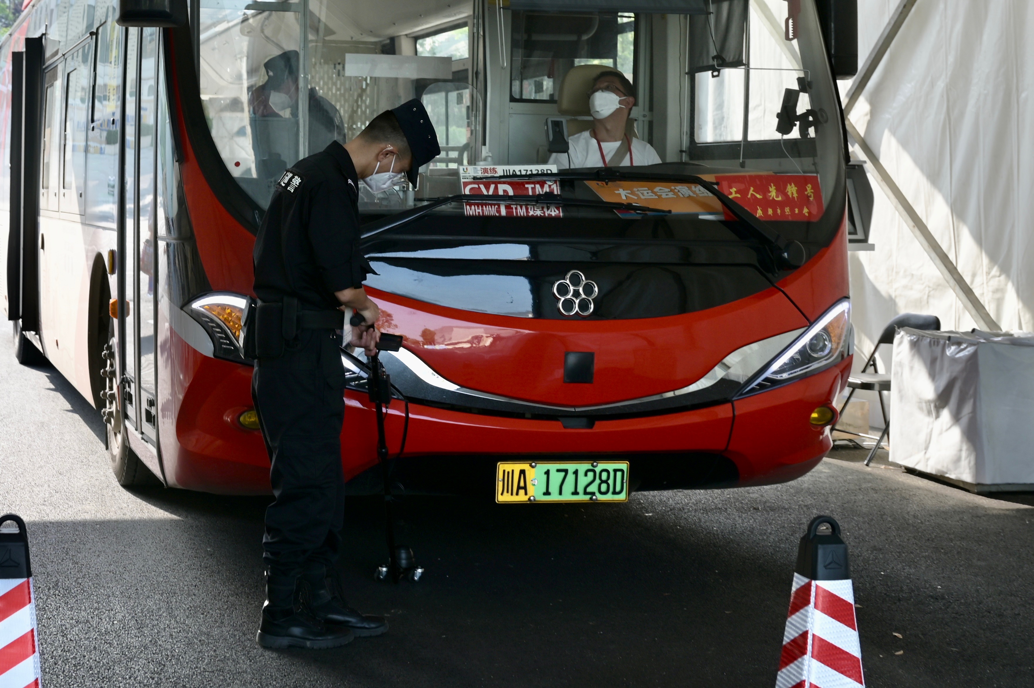 4月23日,则按照成都大运会正赛标准和要求,模拟成都大运会击剑项目决赛日这一天的媒体报道流程进行演练。早上6点40分,多辆媒体班车分批从媒体酒店停车场出发,首先抵达位于龙泉驿区东安书院的主媒体中心,媒体记者在这里转乘前往成都大运会击剑项目的竞赛场馆——郫都赛区击剑场馆。下车后,在经过安保、防疫的安检程序后,媒体记者进入到击剑场馆的媒体中心,开始各自工作。