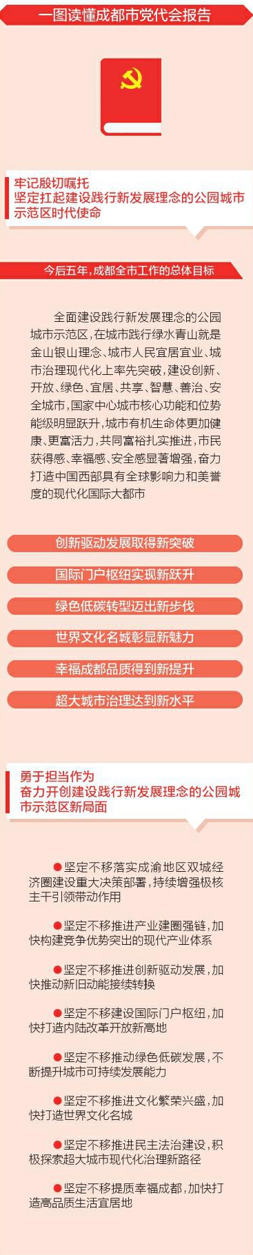 全面建设践行新发展理念的公园城市示范区,奋力打造中国西部具有全球影响力和美誉度的现代化国际大都市。4月26日,中国共产党成都市第十四次代表大会报告为成都今后五年工作锚定方向。