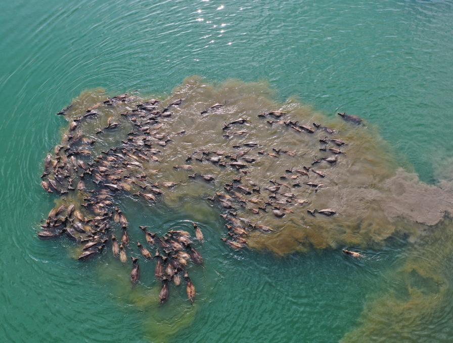 “在江中,牛儿们还不时变换队形,跳起了‘水上芭蕾’。”