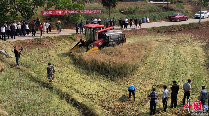 在昭化区卫子镇新荣村,连片3000余亩金黄色的油菜荚颗粒饱满、挂满枝头。在油菜联合机收现场会上,“铁牛”来回穿梭,顷刻间,一片片丰硕的菜籽尽收“机囊”。