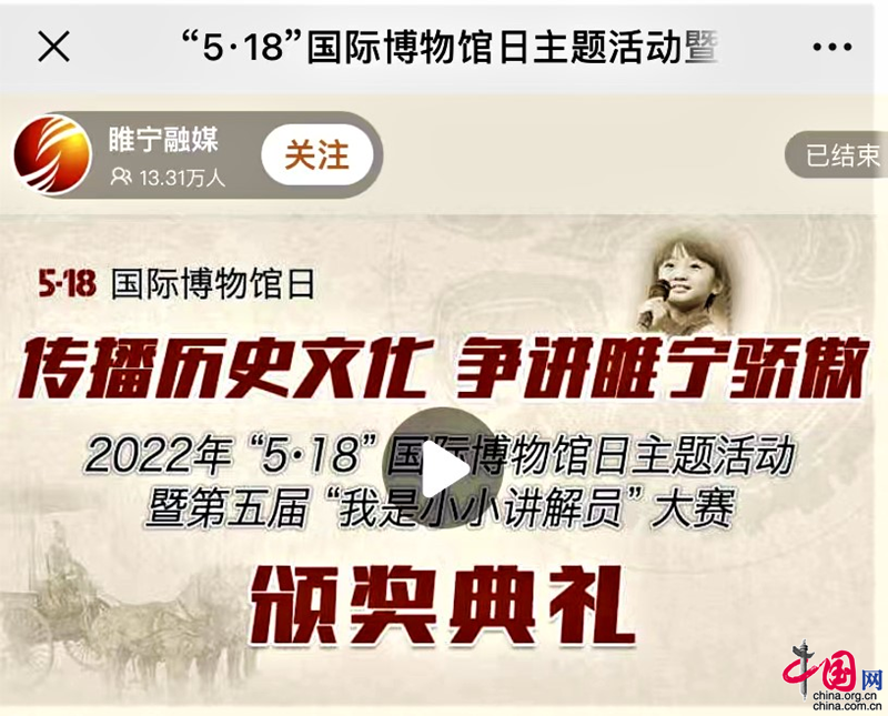 中国网6月8日 6月6日,江苏省徐州市睢宁县“5·18国际博物馆日”主题活动暨“传播历史文化 争讲睢宁骄傲”第五届“我是小小讲解员”终于迎来了决赛。9岁王秋媛《东汉车马出行画像石》、 11岁王大睿《庖厨宴饮图》等128名小选手的讲解,唤起了在线13.31万观众内心对睢宁优秀传统文化的自豪和对睢宁日新月异发展的赞美。