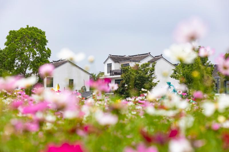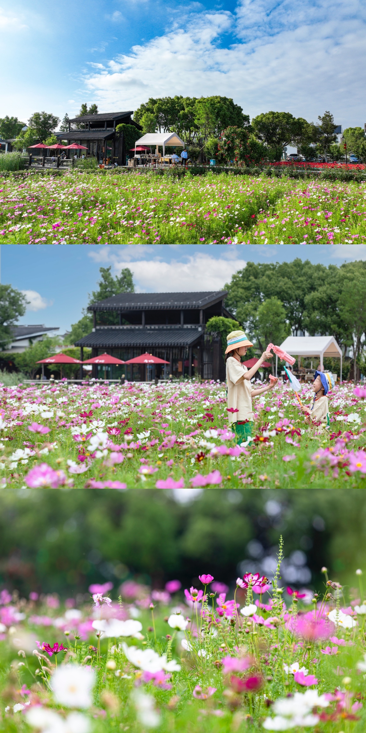 五彩缤纷的波斯菊蔚然成海,粉嫩的月见草温柔可人,爱心长廊环绕着的玫瑰娇艳欲滴,白墙黛瓦的香村掩映在花海深处。