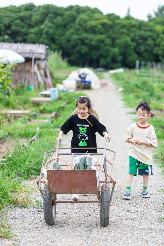 一排排黄瓜架整齐青翠,一根根黄瓜躲在叶子下,和小朋友玩起了捉迷藏;各种农具成了小朋友新奇的玩具。