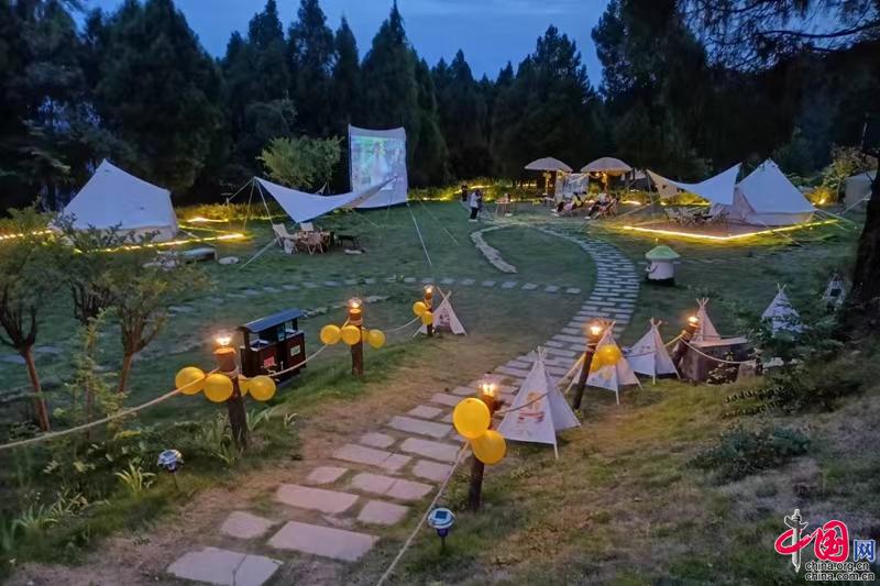 在这里,游客不仅可以小酌谈天,还可以享受钓鱼、丛林穿越等游乐项目。夜幕降临,露天电影也开始播放,一排排氛围灯亮起,在暗夜里闪闪发光,成为了山间的一抹亮色。