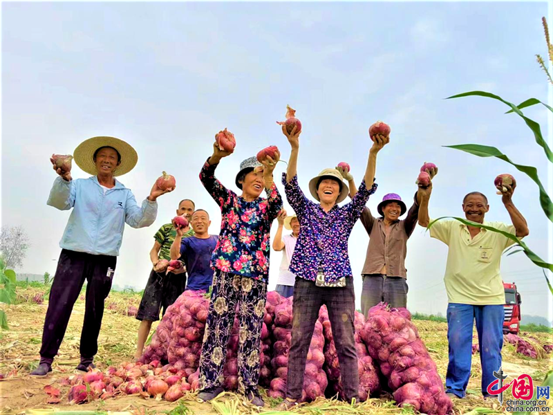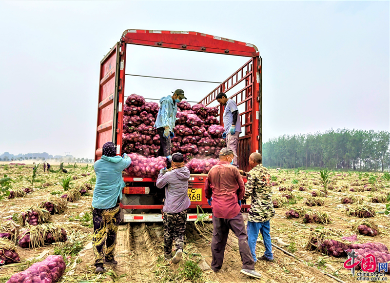 中国网6月16日讯 6月13日,在江苏省睢宁县王集镇吴庙村洋葱种植基地里,田里堆满了刚拔出来的洋葱,年纪稍大的村民正忙着给洋葱分拣、装袋,年龄轻的壮劳力在忙着搬运、装车,到处是农民群众收获洋葱的忙碌身影,150亩洋葱地里上演着丰收的喜人场景。