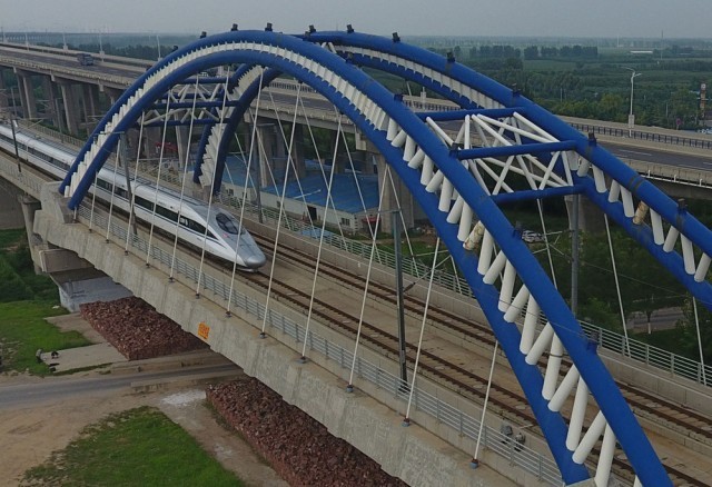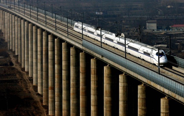 ↑一辆试运行的“和谐号”列车经过郑西高铁河南三门峡市境内的一座高架桥(2010年1月16日摄)。新华社记者 王颂 摄