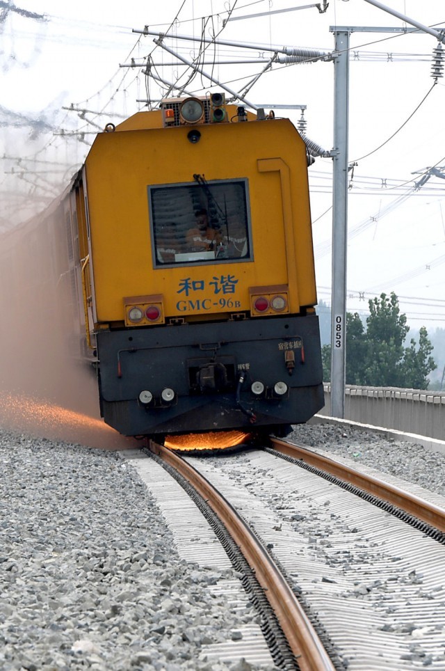 ↑一辆钢轨打磨车在郑渝高铁河南段的一处弯道作业(2019年7月18日摄)。新华社记者 李安 摄