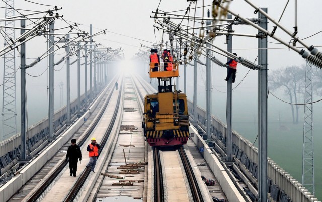 ↑中铁电气化局集团三公司的工作人员在工程车上架设郑徐高铁接触网导线(2015年12月7日摄)。新华社记者 李安 摄