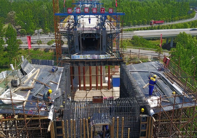 ↑施工人员在郑阜高铁先开段跨商周高速连续梁施工现场作业(2017年8月15日摄)。新华社记者 李安 摄