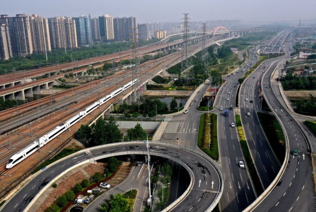 ↑这是郑州东站附近一处京广、徐兰高铁交汇的立体枢纽(2016年9月1日摄)。新华社记者 李安 摄