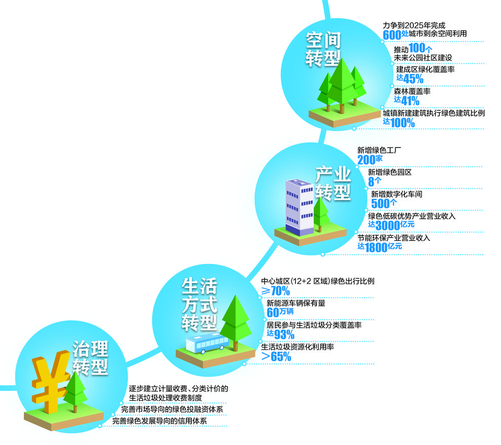 根据《规划》,到2025年,绿色低碳优势产业营收达3000亿元,绿色技术创新市级以上平台达150个,新能源车辆保有量60万辆,中心城区绿色出行比例至少70%。到2035年,实现超大城市全面绿色低碳发展,城市大美空间布局形态充分彰显,高质量发展的绿色低碳循环发展产业体系全面建成。