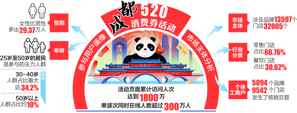 数据还勾勒出此次成都“520”消费券活动的用户画像——从性别来看,女性比男性多出29.37万人。从年龄来看,25岁至50岁的居民是参与的主力人群,其中30-40岁人群占比最大,达34.2%;50岁以上人群占比约10%,大众抢券用券活跃。