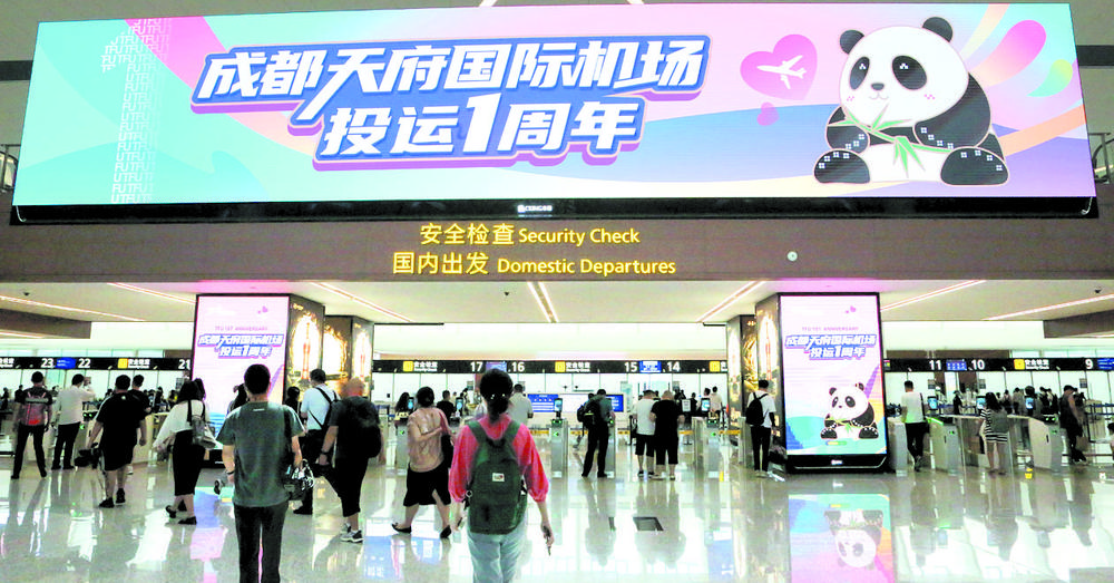 6月27日,成都天府国际机场航站楼随处可见投运一周年的标语。