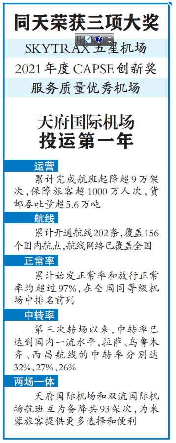 在通航投运一周年之际,天府国际机场斩获两项大奖:荣获“SKYTRAX五星机场”称号,这是国内第四家、西南首家获此殊荣的机场;获评2021年度CAPSE创新奖。据了解,“SKYTRAX五星机场”是SKYTRAX测评机制的最高荣誉。