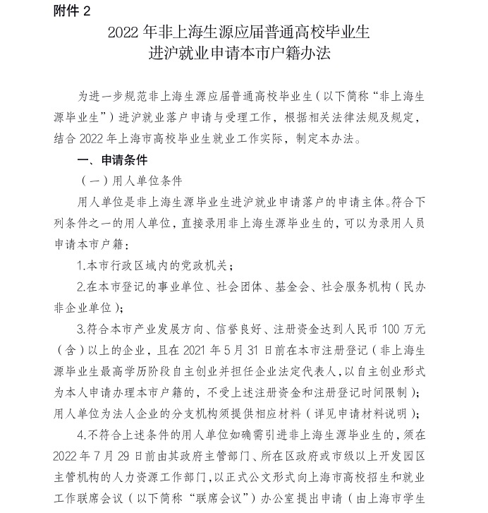 根据6月28日公布的《2022年非上海生源应届普通高校毕业生进沪就业申请本市户籍办法》,申请条件包括“用人单位条件”和“非上海生源毕业生条件”。