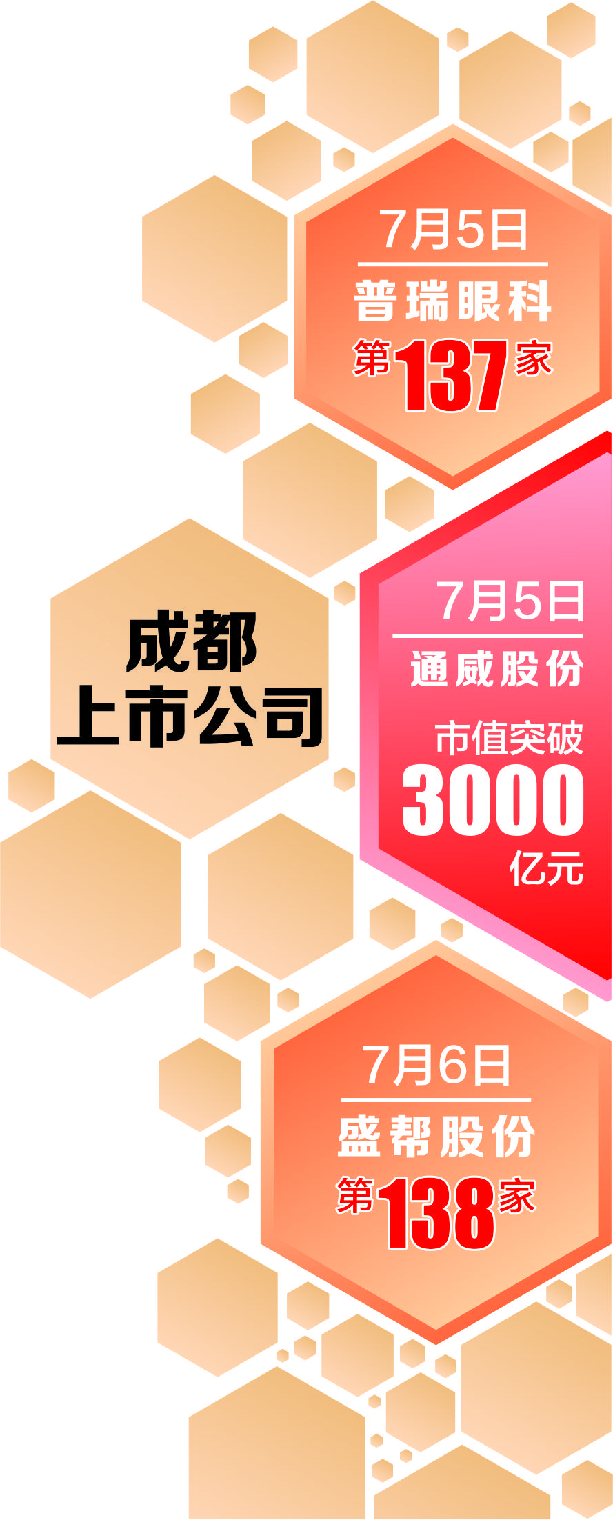 增量的同时,“成都军团”也进一步提质——7月5日通威股份公布业绩快报,上半年公司实现净利润120亿元—125亿元。利好刺激之下,公司股价创出历史新高,市值成功突破3000亿元。值得一提的是,这是成都首家市值突破3000亿元的上市公司。