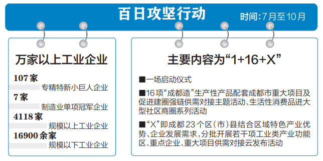 百日攻坚行动的主要内容为“1+16+X”。除了一场启动仪式外,还将开展16项“成都造”生产性产品配套成都市重大项目及促进建圈强链供需对接主题活动、生活性消费品进大型社区商圈系列活动。“X”即成都23个区(市)县结合区域特色产业优势、企业发展需求,分批开展若干项工业类产业功能区、重点企业、重大项目供需对接云发布活动,打造供应链深度协同的融通发展模式。