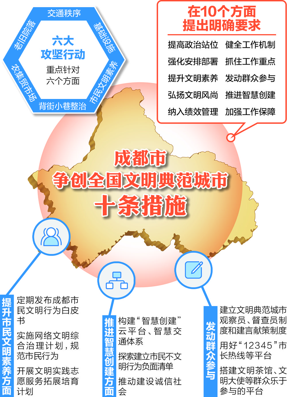 省第十二次党代会报告提出,支持成都创建全国文明典范城市。市第十四次党代会报告提出,成都将积极创建全国文明典范城市。为系统解决成都创建全国文明典范城市实施过程中根本性、全局性的问题,近日,成都市委办公厅、市政府办公厅印发《成都市争创全国文明典范城市十条措施》(简称《措施》),优化了争创全国文明典范城市的制度体系,并提出了一系列务实举措。