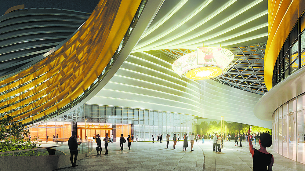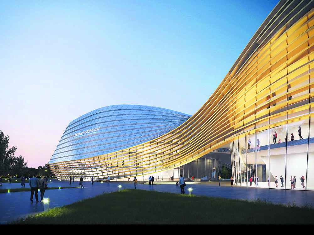 呈“8”字形的两幢主体建筑从金沙文化中提取灵感,将文化元素编织进建筑之中,表达出“金玉呈祥”的美好愿望——这是成都正在建设的重大文化设施金沙演艺综合体未来将会呈现的样子。