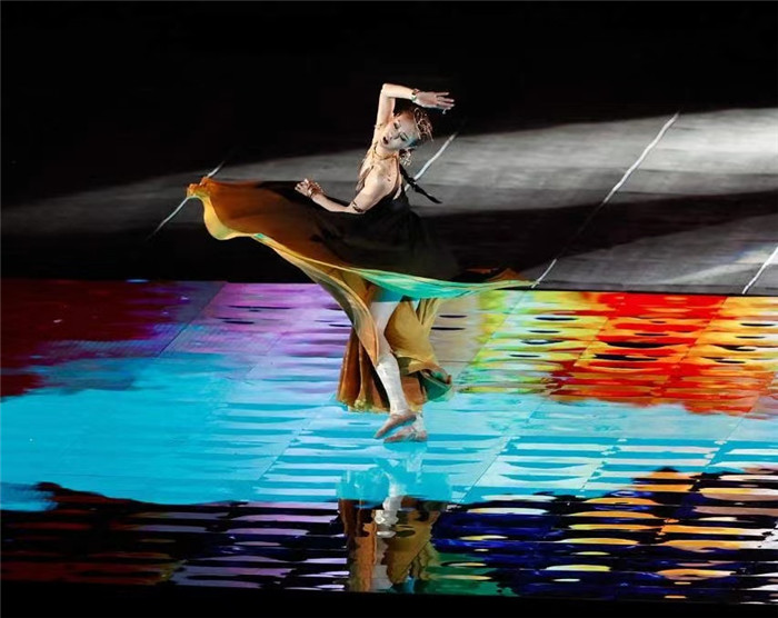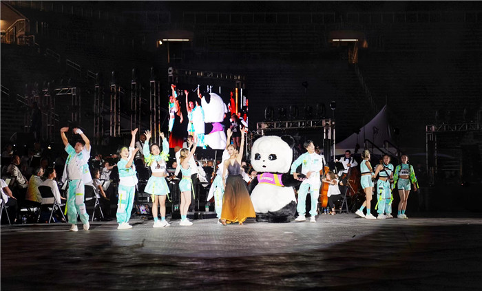 文艺展示以秋、冬、春、夏四季为顺序展开,随四季的变换呼应出音乐、舞蹈、灯光视效等元素的变化。寓意丰收、成就的“秋”,以美轮美奂的视频画面展现大美的雪山下的公园城市。“冬”,则以独舞的形式展现传说中的太阳神鸟对蜀人的护佑。在朝气蓬勃的“春”的篇章,世运会的各个比赛项目则与成都人的日常生活、运动完美地结合在了一起。“夏”的热情与活力,则以伯明翰现场与视频呈现的成都地标场景中的啦啦操街舞演员斗舞展现。最后,在“友谊地久天长”乐曲声中,来自成都各行各业的人们热情欢迎全世界的朋友来到成都。憨态可掬的熊猫人偶形象也不时在活动中穿插,并与观众互动,向全世界发出2025年相约中国,相约成都、“Welcome to Chengdu”的邀请。