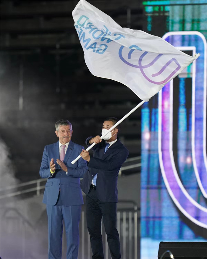 在暖场文艺表演、精彩回顾、无人机表演、入场仪式、嘉宾致辞等环节后,闭幕式迎来接旗仪式和“成都时间”文艺展示。在接旗仪式环节,国际世界运动会协会会旗从美国伯明翰交接到中国成都。随后,成都作为下一届世界运动会举办城市,精彩呈现了“成都时间”大型展演活动。
