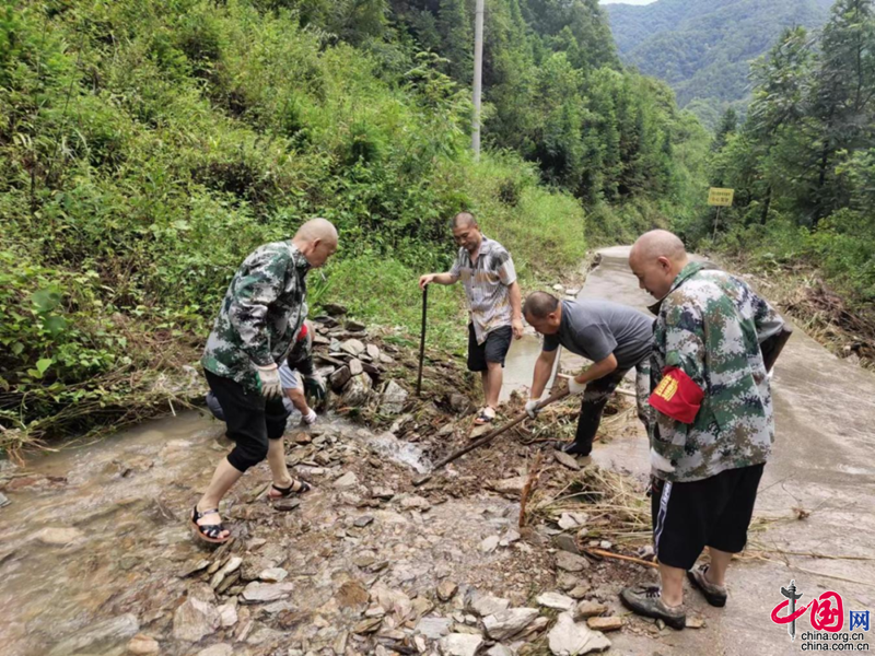 青川县林业局工作人员冒雨开展林区道路抢通保通工作。