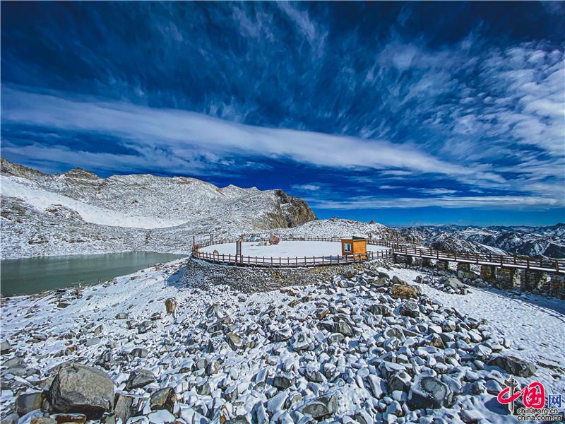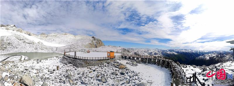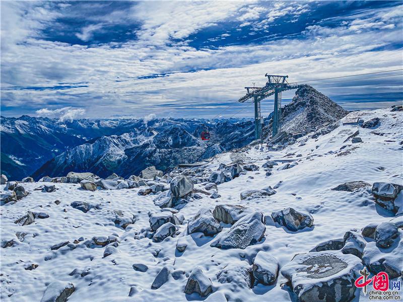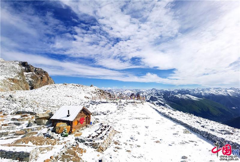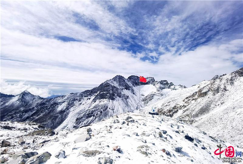今天一早,达古冰川海拔高达4860米的雪山上下起了大雪,山顶雾气弥漫,雪花纷飞,似白纱覆盖。在雪山之巅,晶莹剔透的雪花在雪山上飞舞,飞舞的雪花与红旗共舞,绕白云旋转,疾风环伺,分外妖娆。