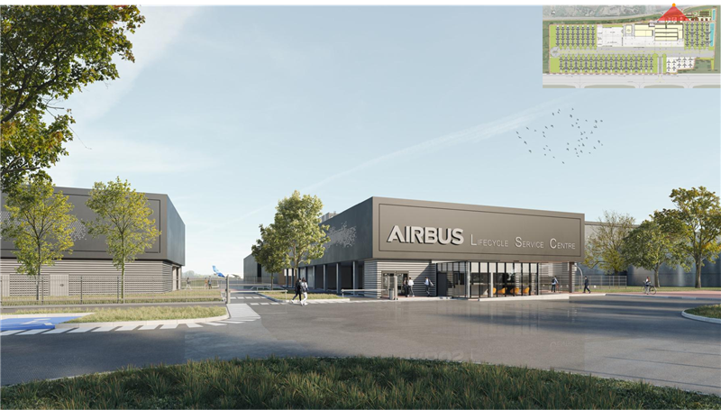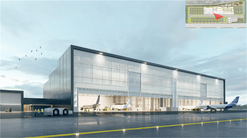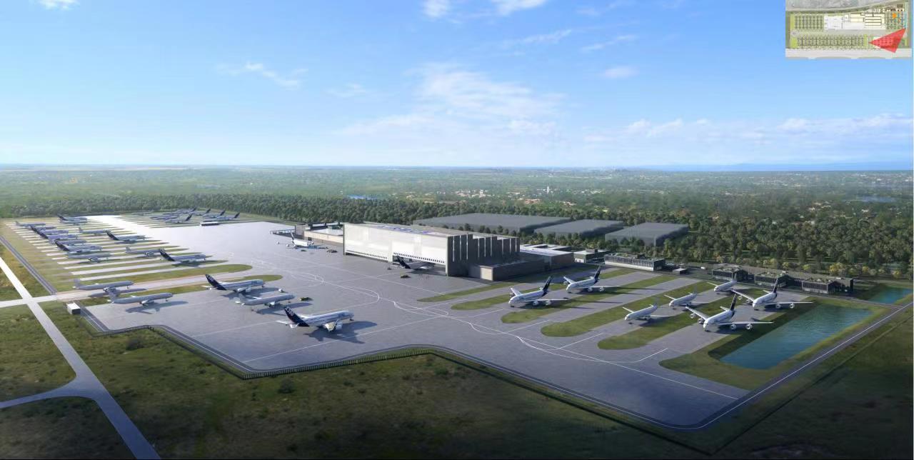 简洁明快的建筑色调,高低错落的建筑高度,整齐排列的飞机机队,屋顶大大的LOGO“AIRBUS”……从设计效果图来看,项目未来的现实模样跃然于纸上。