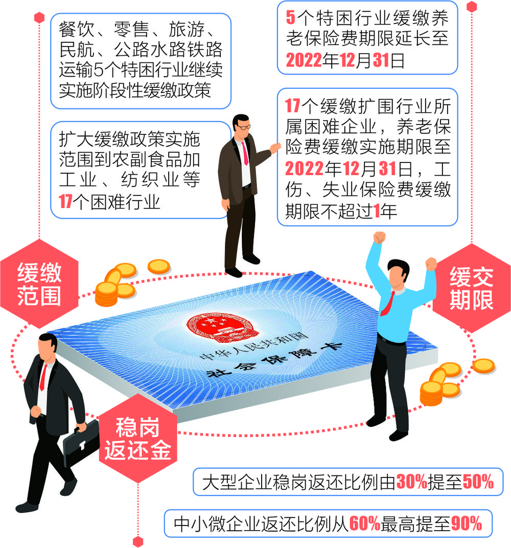 《通知》明确,扩大实施缓缴政策的困难行业范围。其中缓缴范围为餐饮、零售、旅游、民航、公路水路铁路运输5个特困行业(以下简称“5个特困行业”)继续实施阶段性缓缴政策。以产业链供应链受疫情影响较大、生产经营困难的制造业企业为重点,进一步扩大缓缴政策实施范围到农副食品加工业、纺织业等17个困难行业。缓缴扩围行业所属困难企业,可申请缓缴三项社保费单位缴费部分。