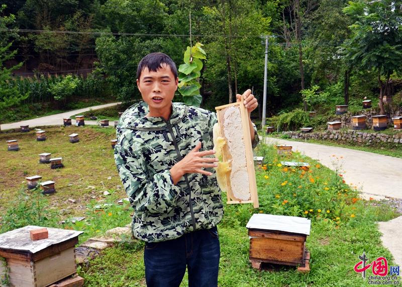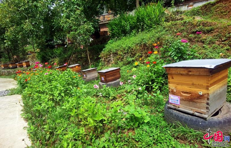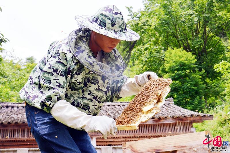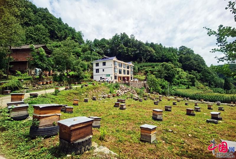翠色的山林从山顶流淌到谷底,直至淹没褐色的岩石。位于朝天区曾家山的两河口镇大尖山村就藏在这秀丽的山水之间,这里山清水秀,漫山遍野的野花,非常适合养蜜蜂。