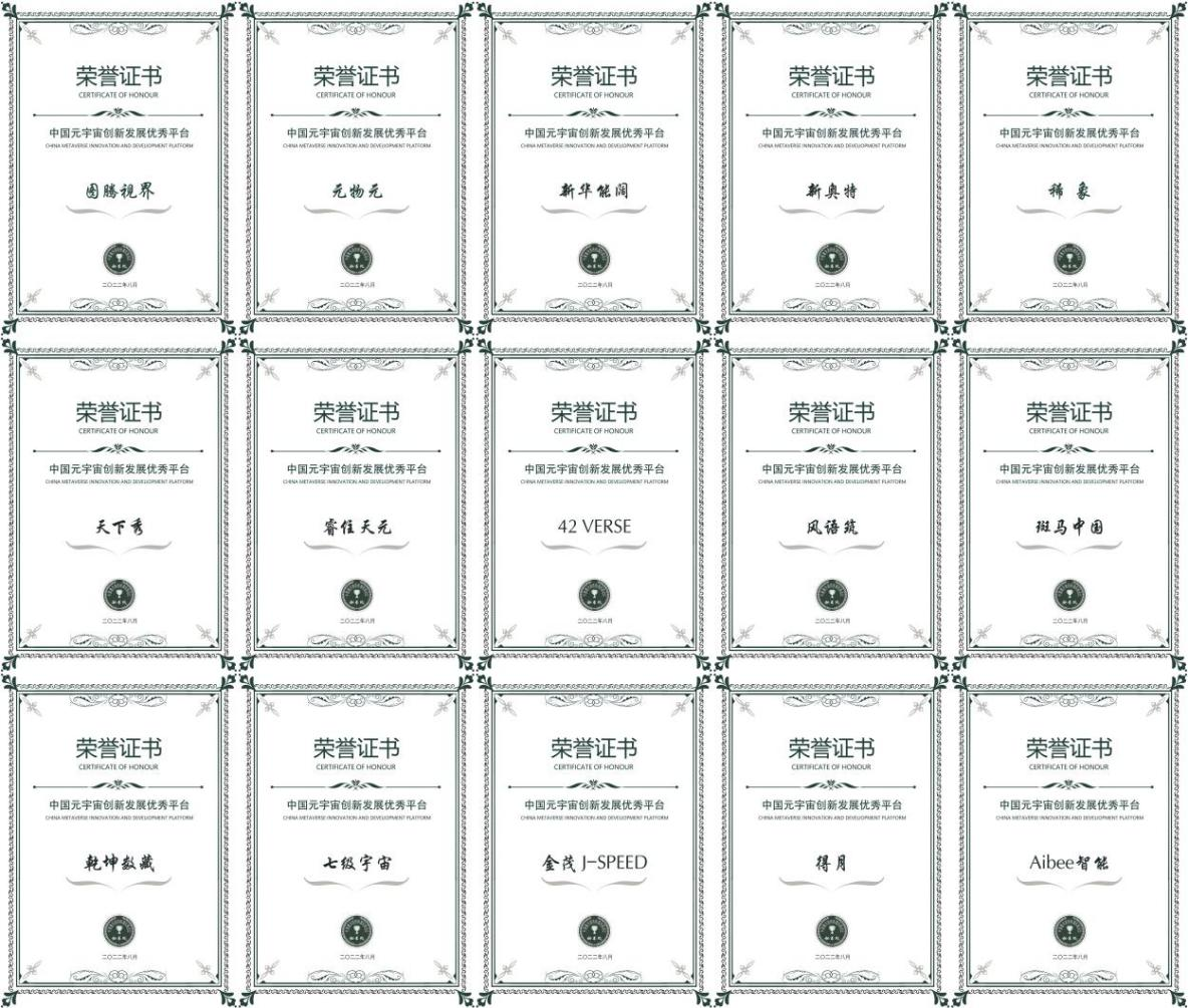 同时,经过充分市场调研和严格评选,本次论坛也评选出15家优秀元宇宙企业代表,获得“中国元宇宙创新发展优秀平台”荣誉称号,分别是:42VERSE、七级宇宙、稀象、得月、新华能阔、斑马中国、乾坤数藏、元物元、睿住天元、风语筑、新奥特、天下秀、金茂J-SPEED、Aibee智能,和图腾视界。