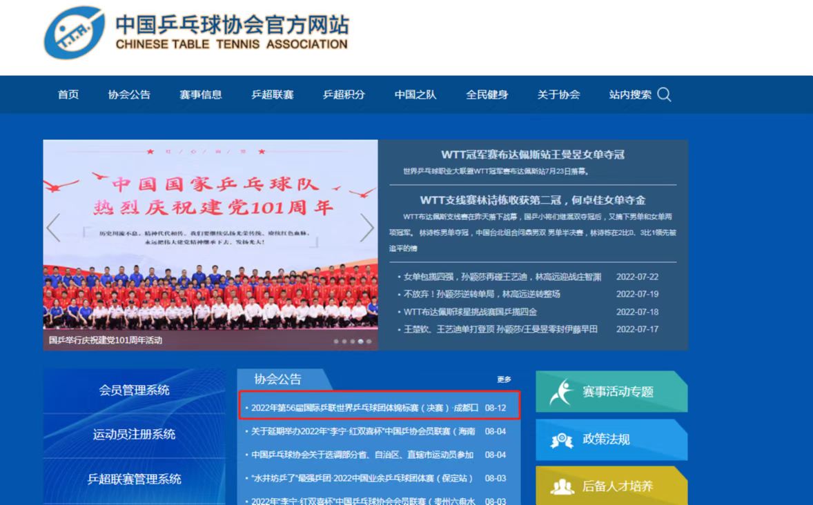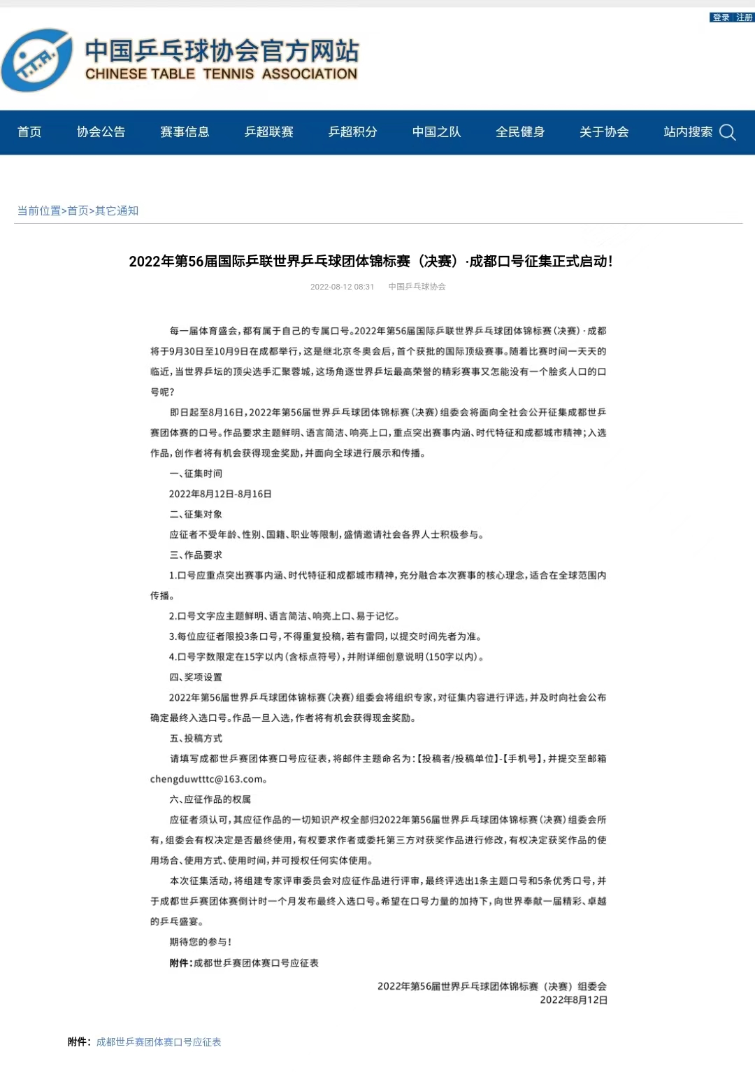 口号征集详情及应征表已在中国乒协官方网站上(https://www.ctta.cn/xhgg/qttz/2022/0812/413401.html)发布。